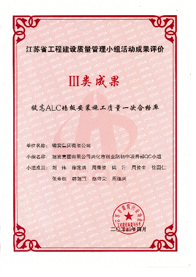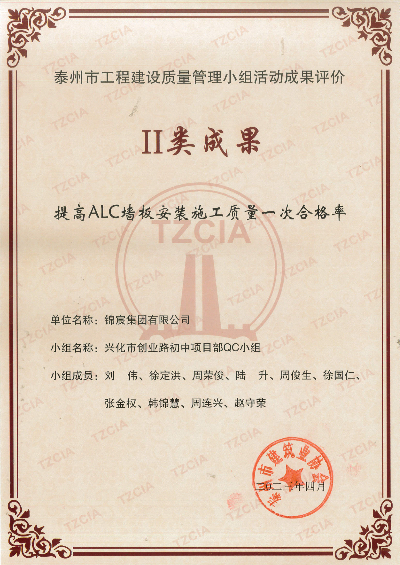 2023年4月QC成果《提高ALC墻板安裝施工質量一次合格率》獲泰州市建筑業(yè)協(xié)會質量管理小組II類成果,省III類成果獎